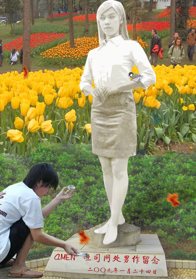 很不协调,四周景物和人物处于正常曝光状态,雕塑却是高曝状态,而且像版画多过像雕塑,缺少层次感