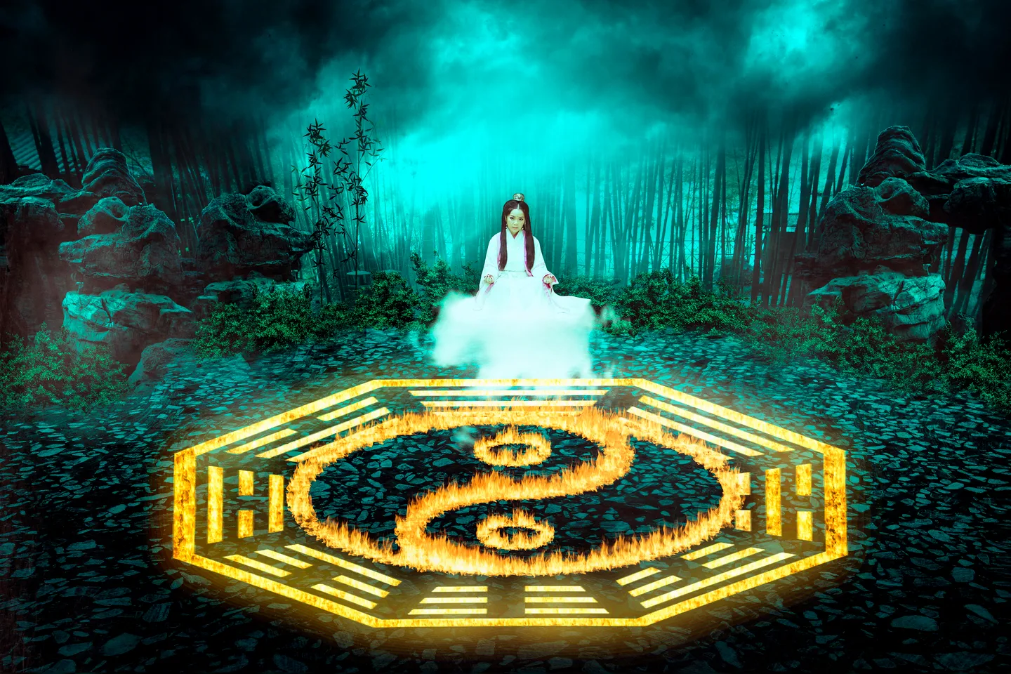一开始想做仙雾缭绕的天宫的感觉,在人物上多修改一些,下载下来后发现人物太虚,天宫素材也难找,于是改变了思路,晚上8点开始边构思边做,做了又删,删了又该,电脑不太给力,渲染整个太极八卦鱼用了俩小时,整到了早上5点才算搞定了,场景大概构思 做好之后怎么把人物糅合进去想了很久,搜天空素材时想到了大闹天宫,随后联想到了孙悟空,然后就是筋斗云。。。