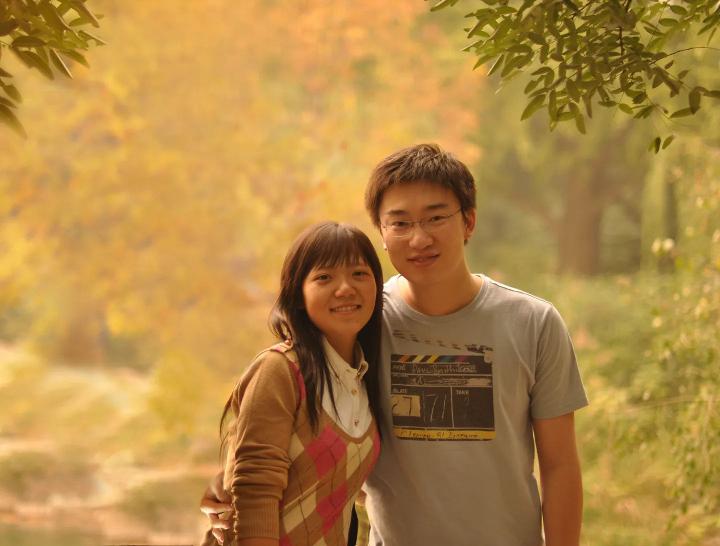 请渲染或者手绘一下人物, 尽量保持原来人物的样貌。女孩子的头发能画的多一点么。。。。。色调请还用这种金黄色比较温暖的感觉。如果可以的话,最好是用后面那种树木的背景,但是把中间那根石柱给去掉。谢谢设计师,辛苦了啊:) 基调:欢悦明快的 艺术化:轻微艺术化 美化身材/体型